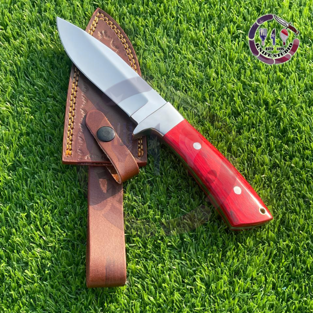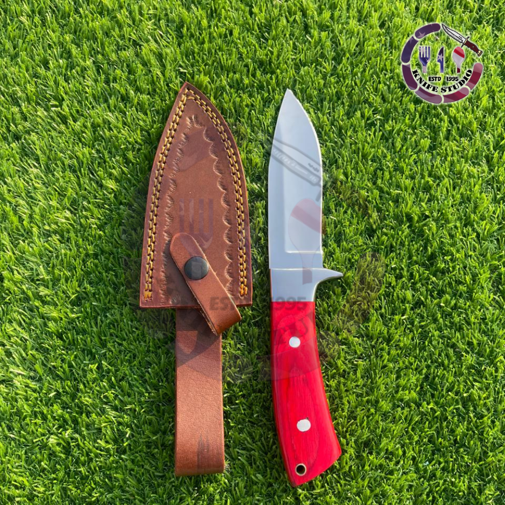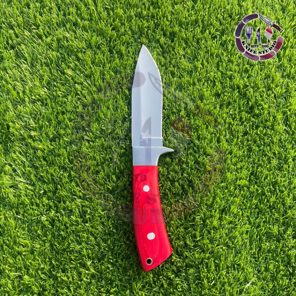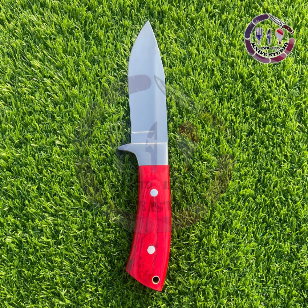 The handle is the centerpiece of this design, featuring a vibrant red grain hardwood that has been contoured for an exceptionally comfortable and secure grip. It is reinforced with a polished steel bolster and secured with three silver-tone pins, including a lanyard hole at the base for added versatility in the field.