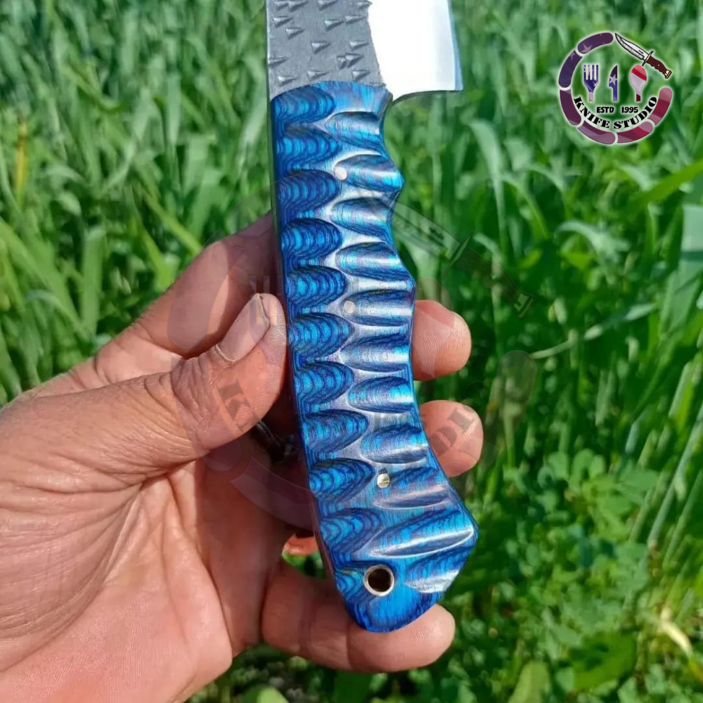 The handle is designed for maximum performance, featuring a vibrant blue textured grip that is ergonomically contoured to fit perfectly in your hand. This specialized texture ensures a non-slip hold even in wet or demanding conditions. The knife is perfectly balanced for a variety of tasks, including chopping, carving, and fine slicing.