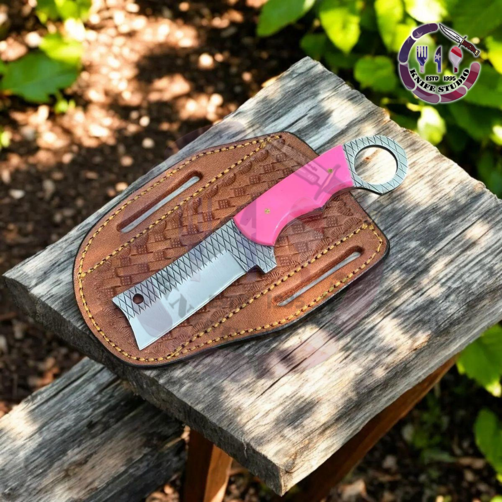 The handle is constructed with vibrant pink scales, offering a high-visibility profile that ensures the tool is never lost in dense brush or a crowded gear bag. The handle is ergonomically shaped for a full-hand grip and transitions into a solid steel finger ring at the pommel. This ring allows for ultimate control and safety, preventing the knife from being dropped during intense use.