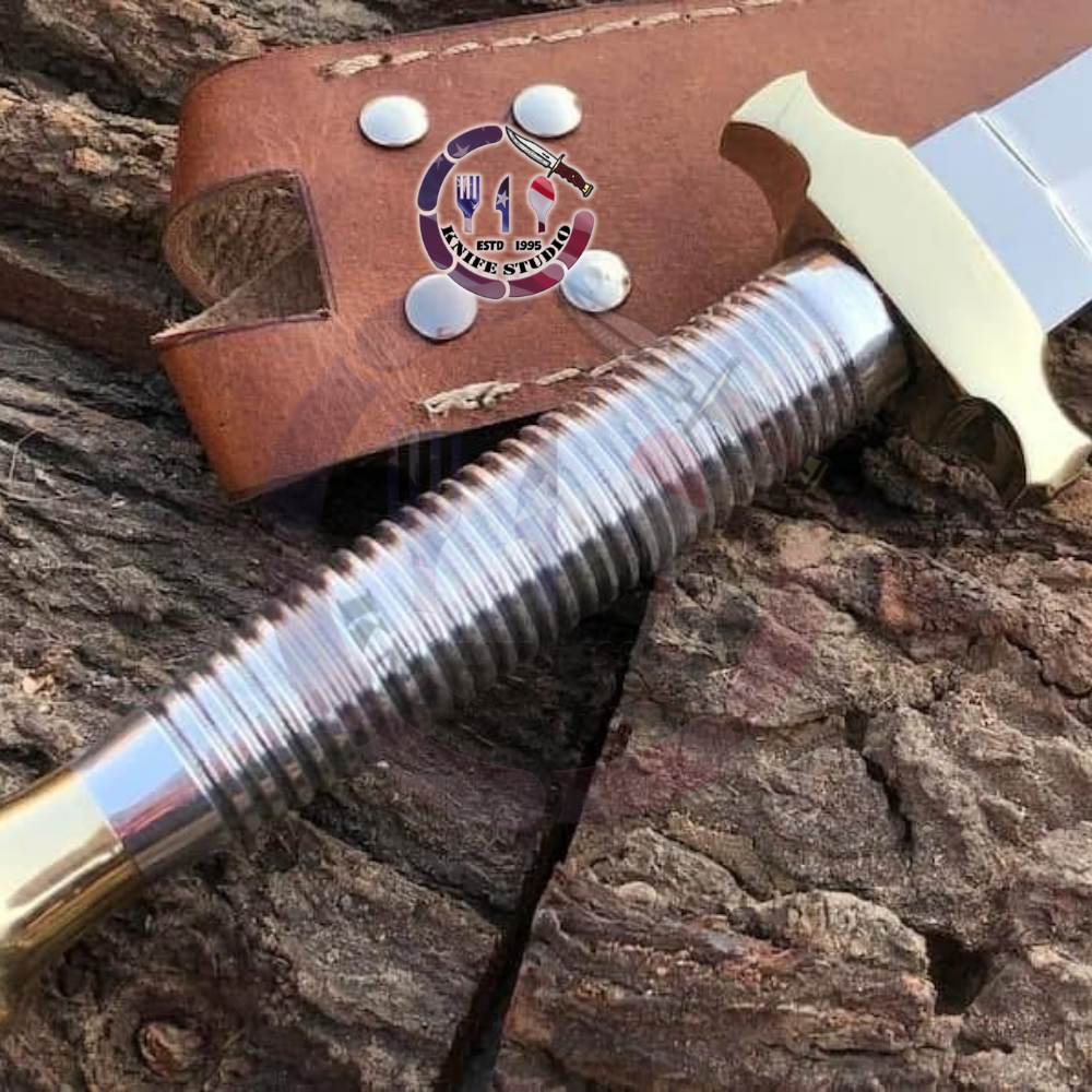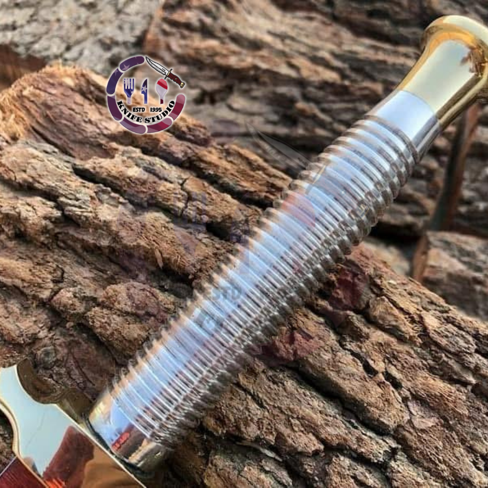 The handle is engineered for maximum control, featuring a ribbed aluminum design that provides an exceptional grip in any condition. It is perfectly weighted with a polished brass-tone guard and a tapered pommel, giving the dagger a traditional yet refined aesthetic.
