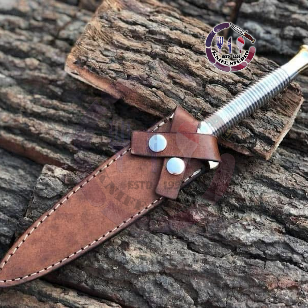 Each dagger comes paired with a heavy-duty brown leather sheath, hand-stitched for durability and featuring reinforced silver-tone rivets. This sheath is designed for safe carry and quick access, making it an ideal companion for outdoor enthusiasts, historical collectors, or as a high-end display piece.