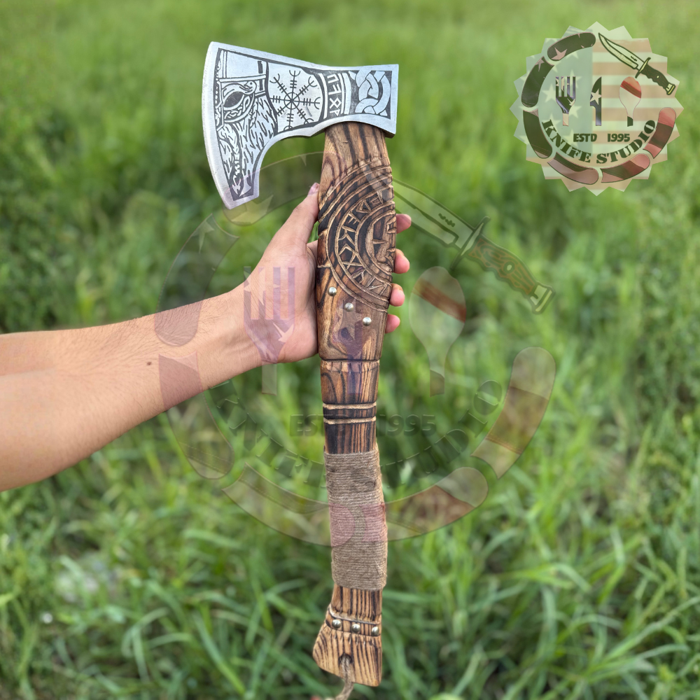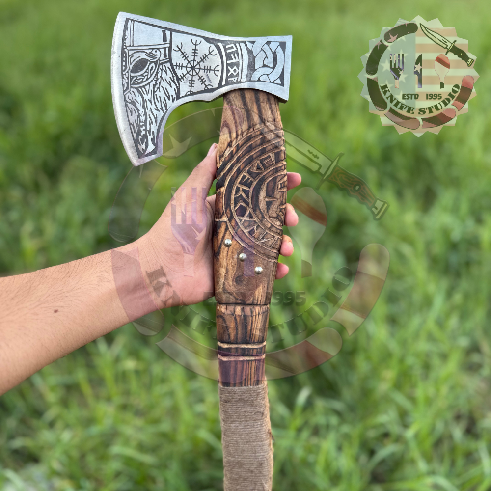 This handmade Viking-inspired axe is a stunning fusion of craftsmanship, artistry, and historic design. The axe head is forged from high-quality steel and adorned with detailed engravings depicting Norse-style patterns and a stylized animal motif, giving it an authentic old-world character.