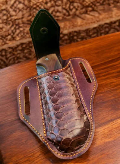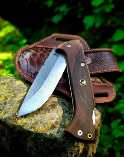 The handle is crafted from natural walnut wood, providing a warm, ergonomic grip. What truly sets this knife apart is its genuine python and cowhide leather sheath ā an exotic and rugged addition that protects your knife in style.