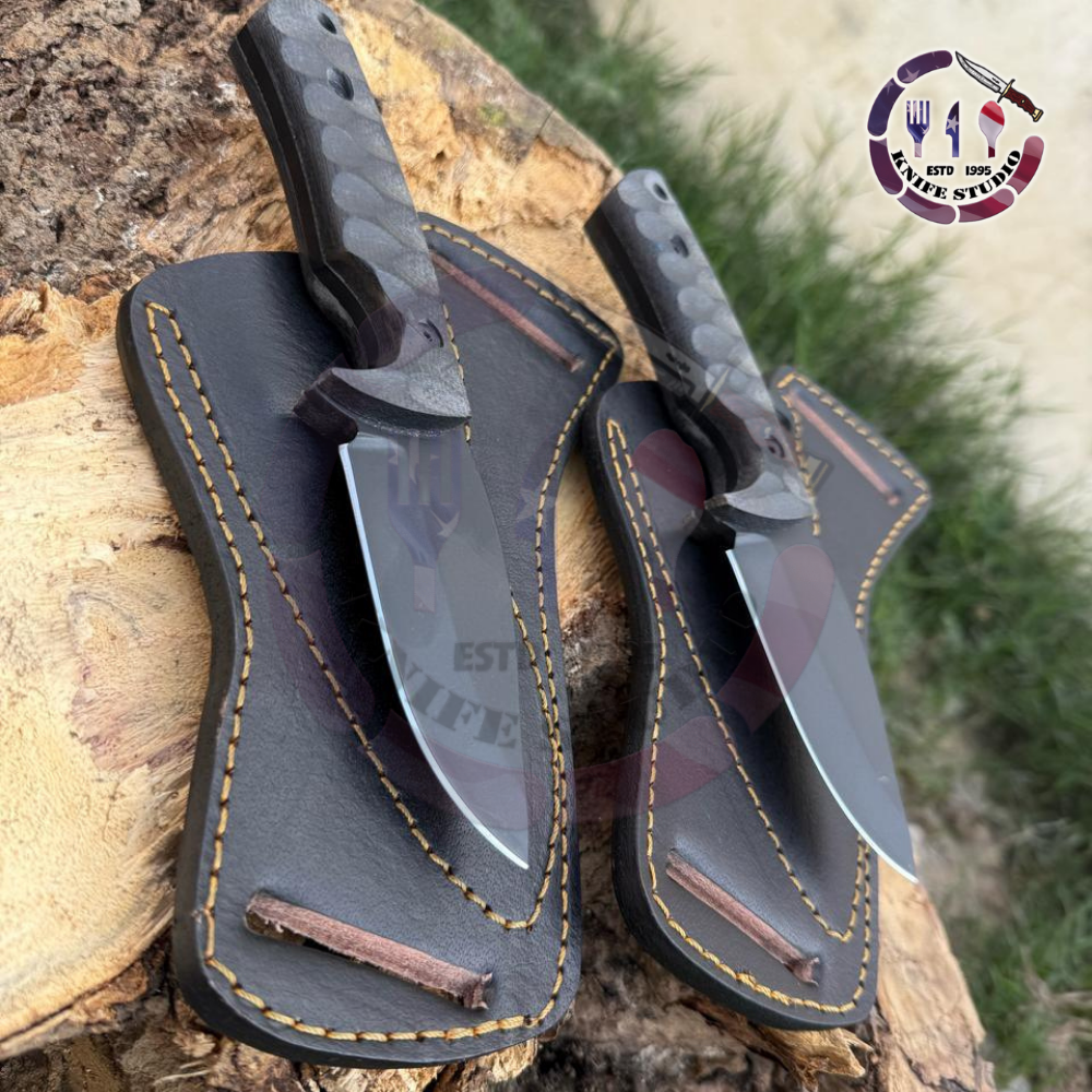 Double your preparedness with this Pack of 2 Custom Hand-Forged 10-inch EDC Hunting Knives. Designed for tactical efficiency and outdoor reliability, each knife in this set features a robust 5-inch blade crafted from high carbon steel. The blades are finished with a non-reflective matte black coating, providing both corrosion resistance and a sleek, low-profile aesthetic.