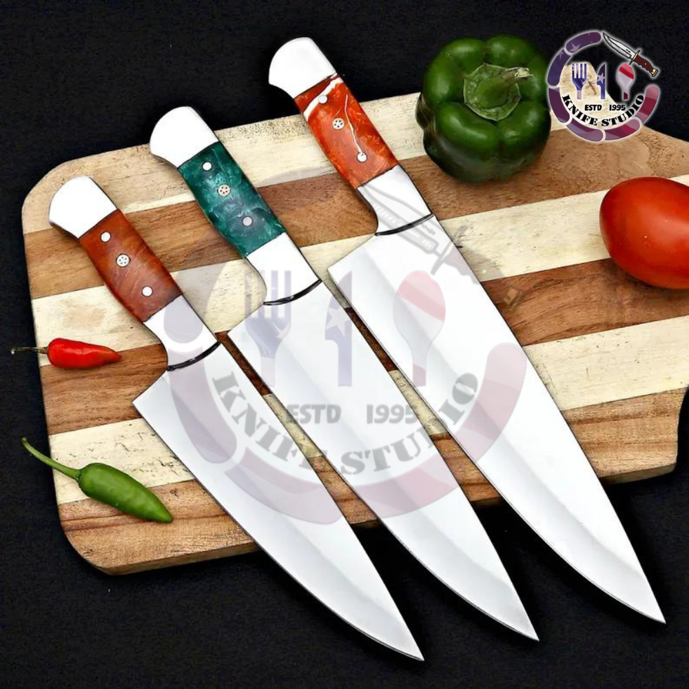 Add precision and personality to your culinary workspace with this Set of 3 Professional High Carbon Stainless Steel Chef Knives. Designed for versatility, this set features three distinct sizes to handle everything from heavy-duty slicing and dicing to fine, delicate prep work.