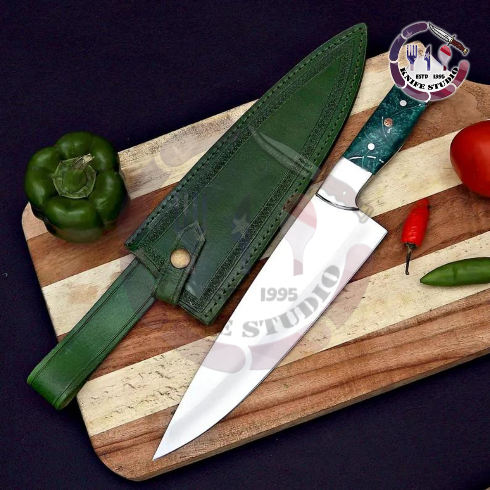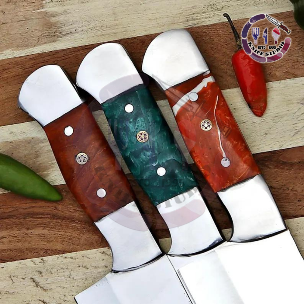 The standout feature of this set is the artisan hybrid handles. Crafted in three striking colors—vibrant red, deep emerald green, and rich amber—each handle is ergonomically shaped for a comfortable grip. The handles are reinforced with polished stainless steel bolsters and pommels, providing a professional weight and feel. Decorative mosaic center pins add a final touch of luxury, making these knives as beautiful on a magnetic rack as they are effective on the cutting board.